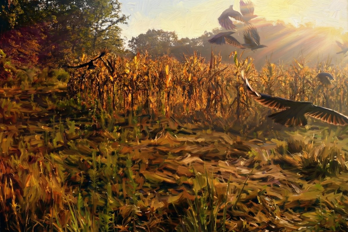 A murder of crows erupts from the edge of a standing cornfield, wings catching the golden rays of an autumn sunrise. The chaos of the flush is frozen mid-moment—dark silhouettes scattering against a backdrop of dried stalks and turning trees. The title nods to literature's most famous bird poet, and the scene delivers: dramatic, moody, alive with motion. Rich, impressionistic brushwork captures the frenzy and warm harvest light.