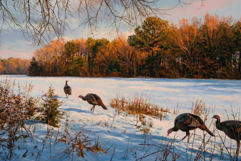 A winter flock of hens crossing the snow at the edge of a field. First light, fresh powder, and the woods coming alive.