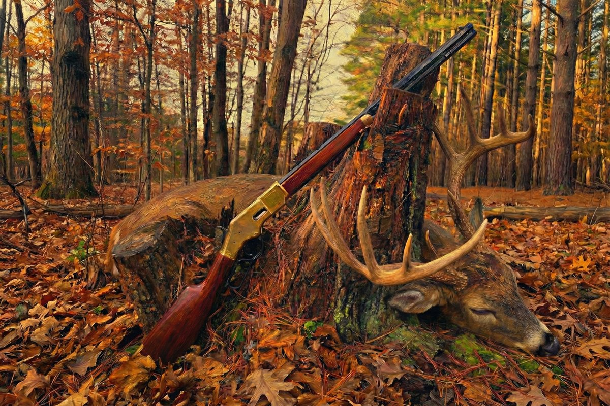 A heavy-racked buck lies at the base of an old stump, a lever-action rifle propped against the wood beside him. The autumn leaves have piled up in drifts of orange and gold, and the late afternoon light turns everything to amber. It's the scene at the end of a successful hunt—that quiet moment after the work is done, when you finally get to sit down and take it all in. The title fits: this is somebody's golden boy, a buck worth remembering. Warm, painterly light gives the piece the feel of a memory, the kind of afternoon that stays with you.
