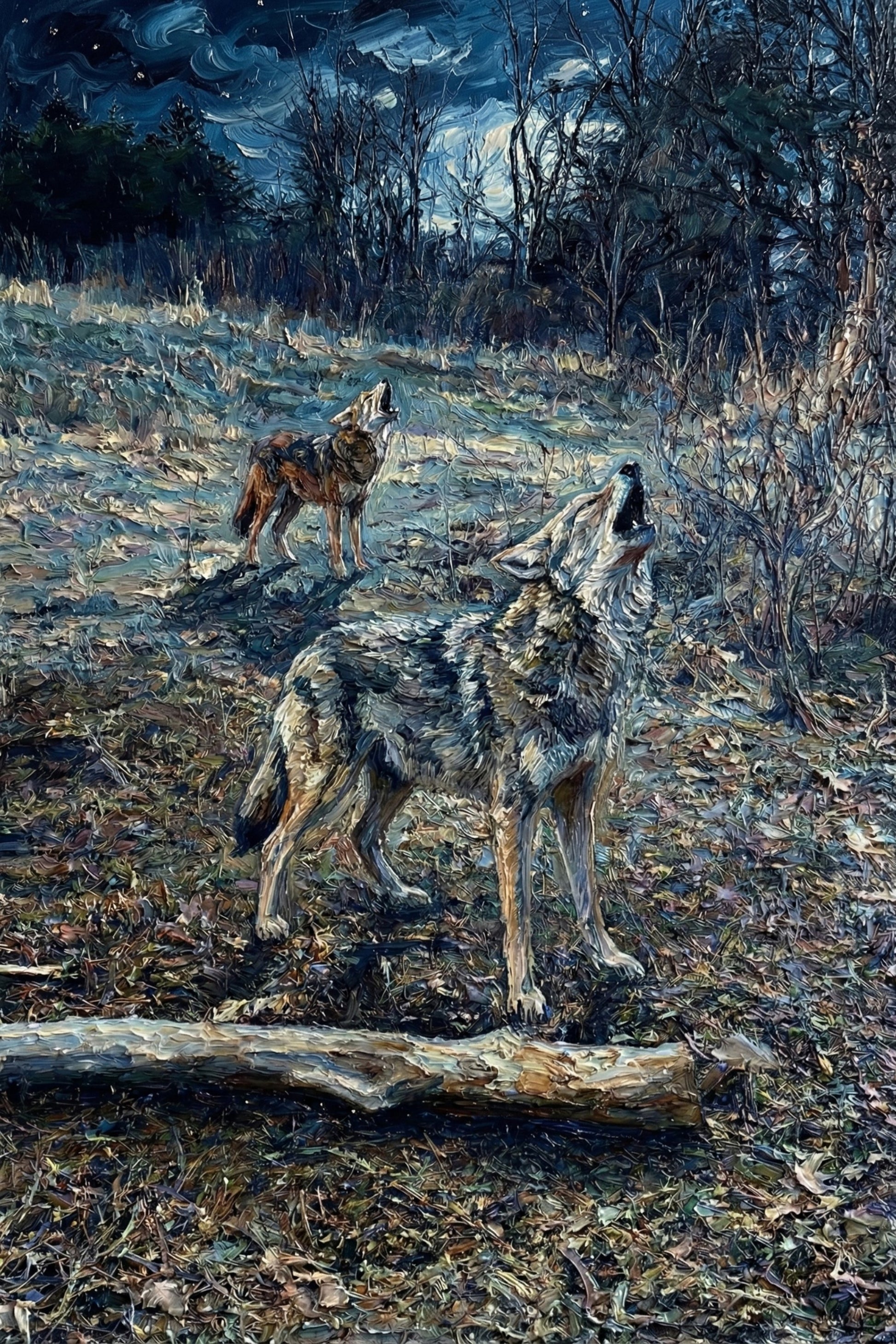 The call that echoes through cold timber. Two voices rising under a Van Gogh sky—wild, ancient, and unapologetic.