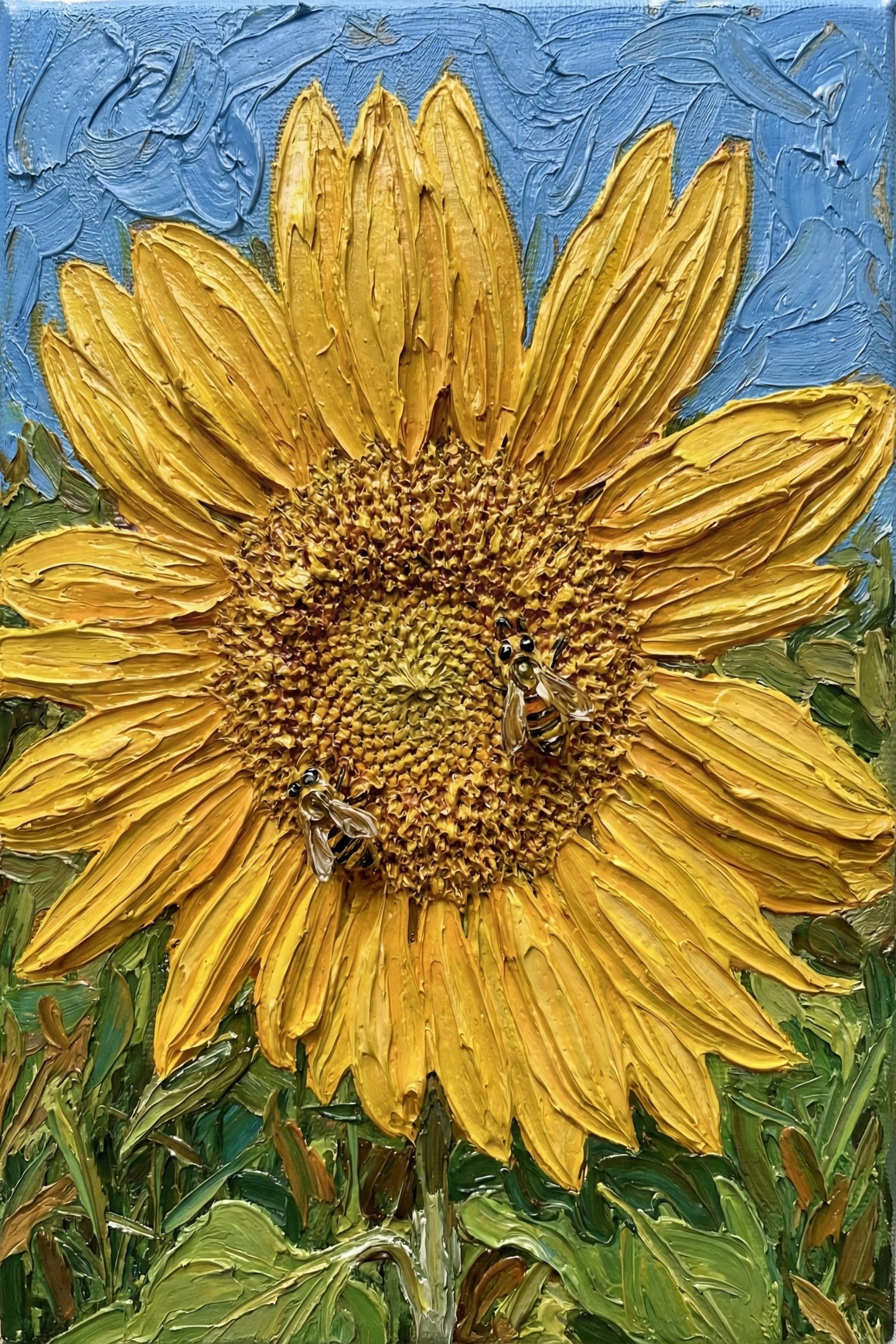 Summer distilled into a single bloom. Heavy impasto brushwork gives this piece real texture you can almost feel—every petal thick with paint, catching the light. Bold, bright, and made to be a statement.